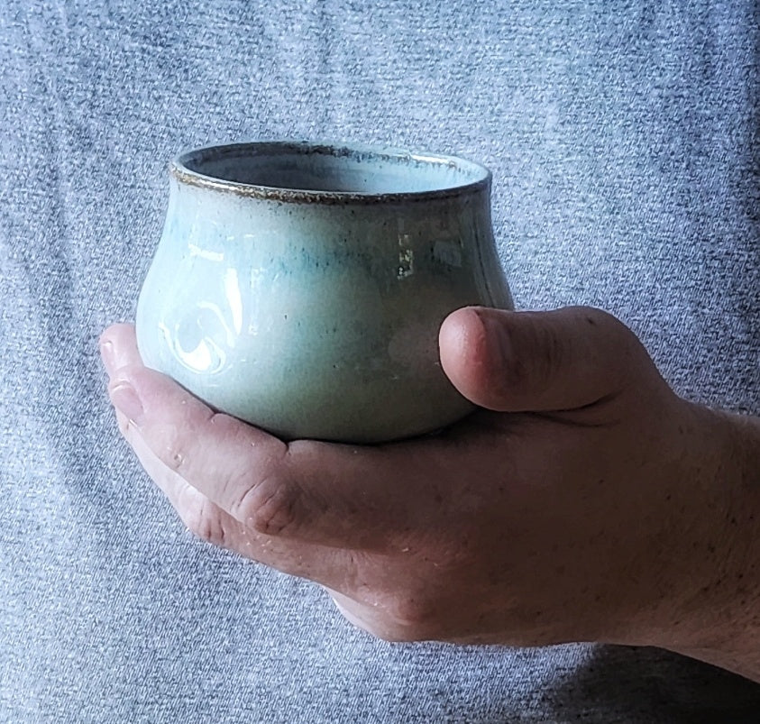 Stoneware. Food, dishwasher, microwave safe. Handwashing recommended. ~3x3.5". Holds ~10 oz.